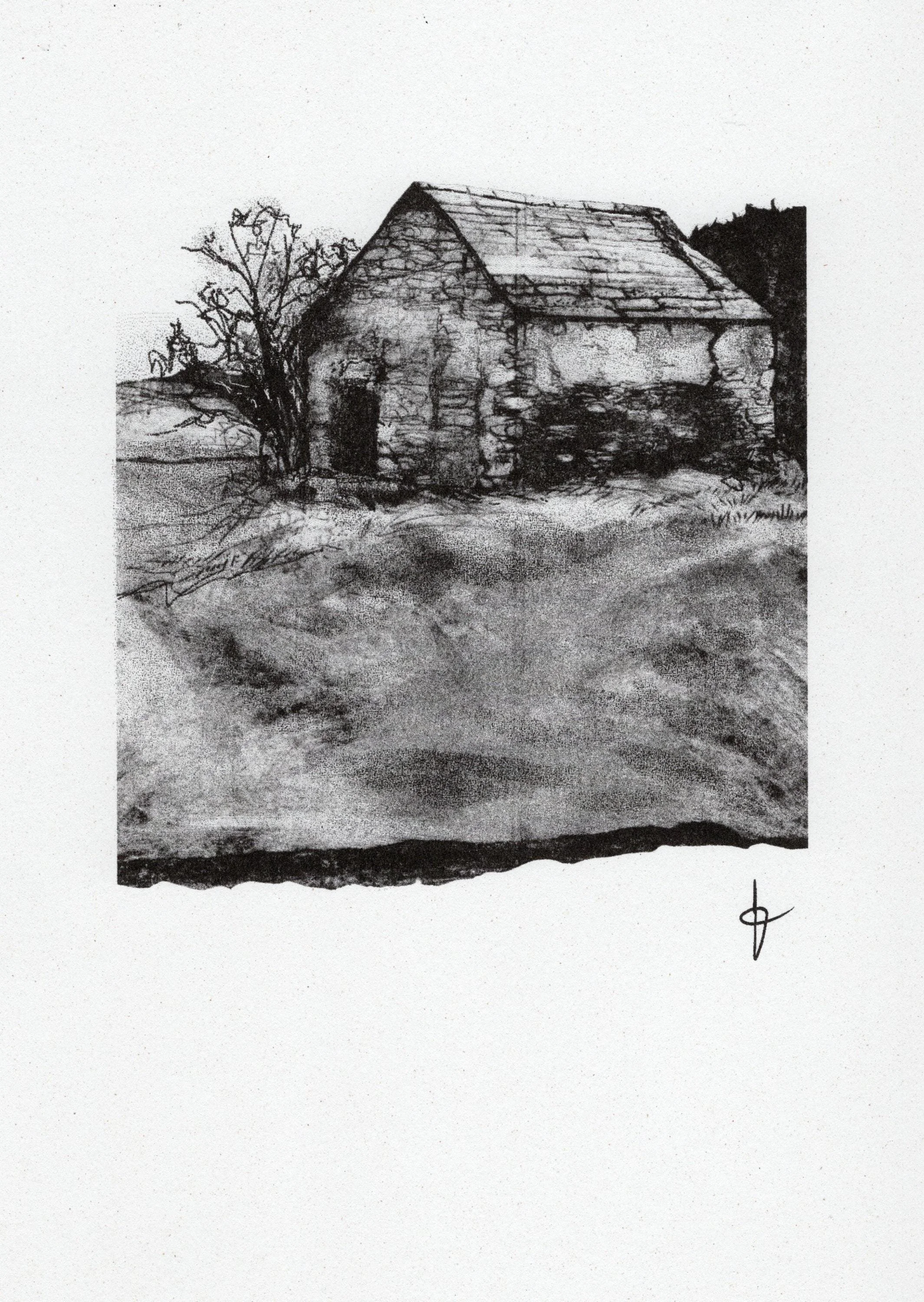 A5 limited edition risograph print produced from a tetrapak print of a derelict field barn in Bonsall, Derbyshire, printed using vegetable-oil based ink onto eco paper. This is an edition of thirty prints onto 160gsm eco paper.